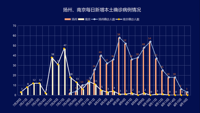 如下圖所示,從兩地疫情發(fā)展來看,南京疫情在前期經(jīng)歷了明顯的日新增高峰期,之后很快下降至日新增個位數(shù),并逐步實現(xiàn)“零新增”;而揚州疫情則經(jīng)歷了較長時間的增長期,曾連續(xù)14天(8月1日到8月14日)保持20例以上的單日新增速度。