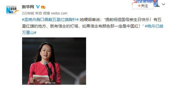 #孟晚舟胸口佩戴五星紅旗胸針# 她哽咽著說:“提前祝祖國母親生日快樂!有五星紅旗的地方,就有信念的燈塔,如果信念有顏色那一定是中國紅!” #晚舟已越萬重山#