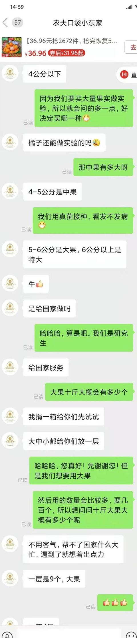 原來(lái)11月11日下午,浙江大學(xué)農(nóng)業(yè)與生物技術(shù)學(xué)院植物病理學(xué)專業(yè)博士研究生肖小娥同學(xué)想要網(wǎng)購(gòu)一些橘子用于實(shí)驗(yàn),商家得知后立馬表示要捐贈(zèng)橘子支持同學(xué)們的科研。“幫不了國(guó)家什么大忙,遇到了就想著出點(diǎn)力。”商家樸實(shí)而炙熱的愛國(guó)心感動(dòng)了同學(xué)們,同學(xué)們也紛紛下單購(gòu)買支持商家的生意。