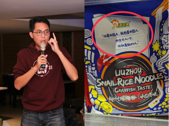 李宗霖(左)爆料,近期有一款從大陸輸入的螺螄粉食品,包裝上出現(xiàn)“你是中國人,我也是中國人,四舍五入一下,你就是我的人”等文字。圖自臺媒