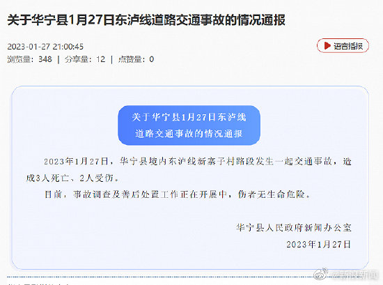 <愛上你,愛上新江南網(wǎng):www.hzgou.cn www.xjnnet.net,www.hzgou.cn歡迎您!> 【#云南一大巴車側翻致3死2傷#】據(jù)華寧縣人民政府新聞辦公室消息:1月27日,華寧縣境內東瀘線新寨子村路段發(fā)生一起交通事故,造成3人死亡、2人受傷。目前,事故調查及善后處置工作正在開展中,傷者無生命危險。3lJ新江南網(wǎng)|江南區(qū)域知名綜合門戶網(wǎng)