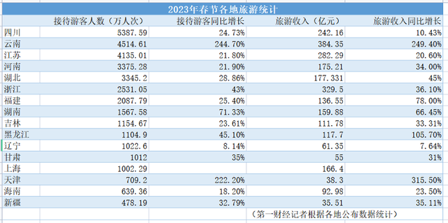 第一財經(jīng)記者統(tǒng)計,截至1月28日,全國已經(jīng)有18個省份公布了春節(jié)旅游數(shù)據(jù)(重慶和貴州公布的是重點監(jiān)測景區(qū)數(shù)據(jù)),包括云南和海南等熱門旅游目的地的數(shù)據(jù)已經(jīng)出爐。從接待游客人數(shù)來看,四川第一;從旅游收入來看,云南第一。