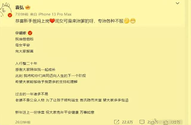 袁弘用調(diào)侃的語氣恭喜道:恭喜新手爸媽上崗,閨女可是來治爹的,專治各種不服。由其話語中不難了解,袁弘對于胡歌的秘密結(jié)婚生女應(yīng)該早就知曉。