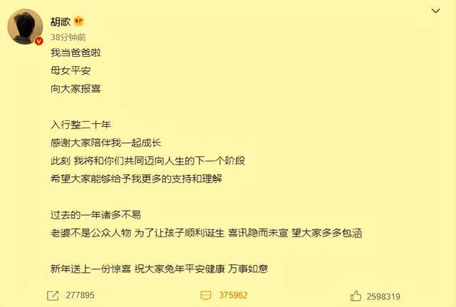 胡歌在留言處興奮的說道:入行整二十年,感謝大家陪伴我一起成長,此刻,我將和你們共同邁向人生的下一個階段,希望大家能夠給予我更多的支持和理解。除此之外,他還透露妻子是圈外人,為了能讓孩子順利出生,所以未有公布喜訊。