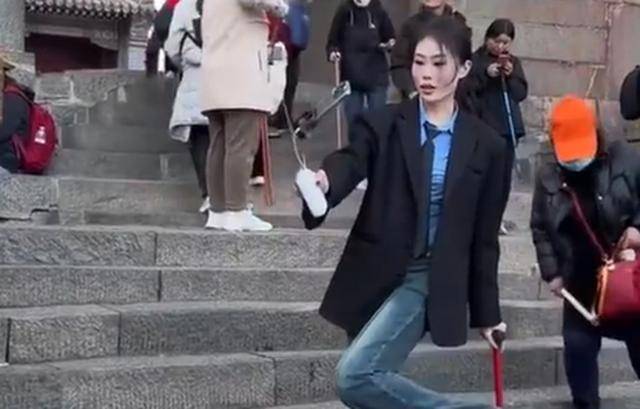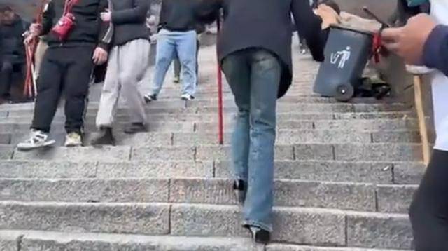 3月27日,一女子挑戰(zhàn)穿10公分高跟鞋爬泰山,畫(huà)面中女子邊拄著拐杖邊拍視頻記錄爬山過(guò)程。
