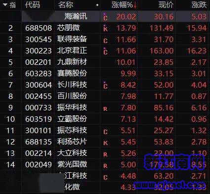芯片股表現(xiàn)強勢,今天盤中也創(chuàng)新高,上午尾盤有所跳水。上海捍瀚汛20%漲停,芯朋微、北京君正漲超10%,千億市值紫光國微大漲5%。