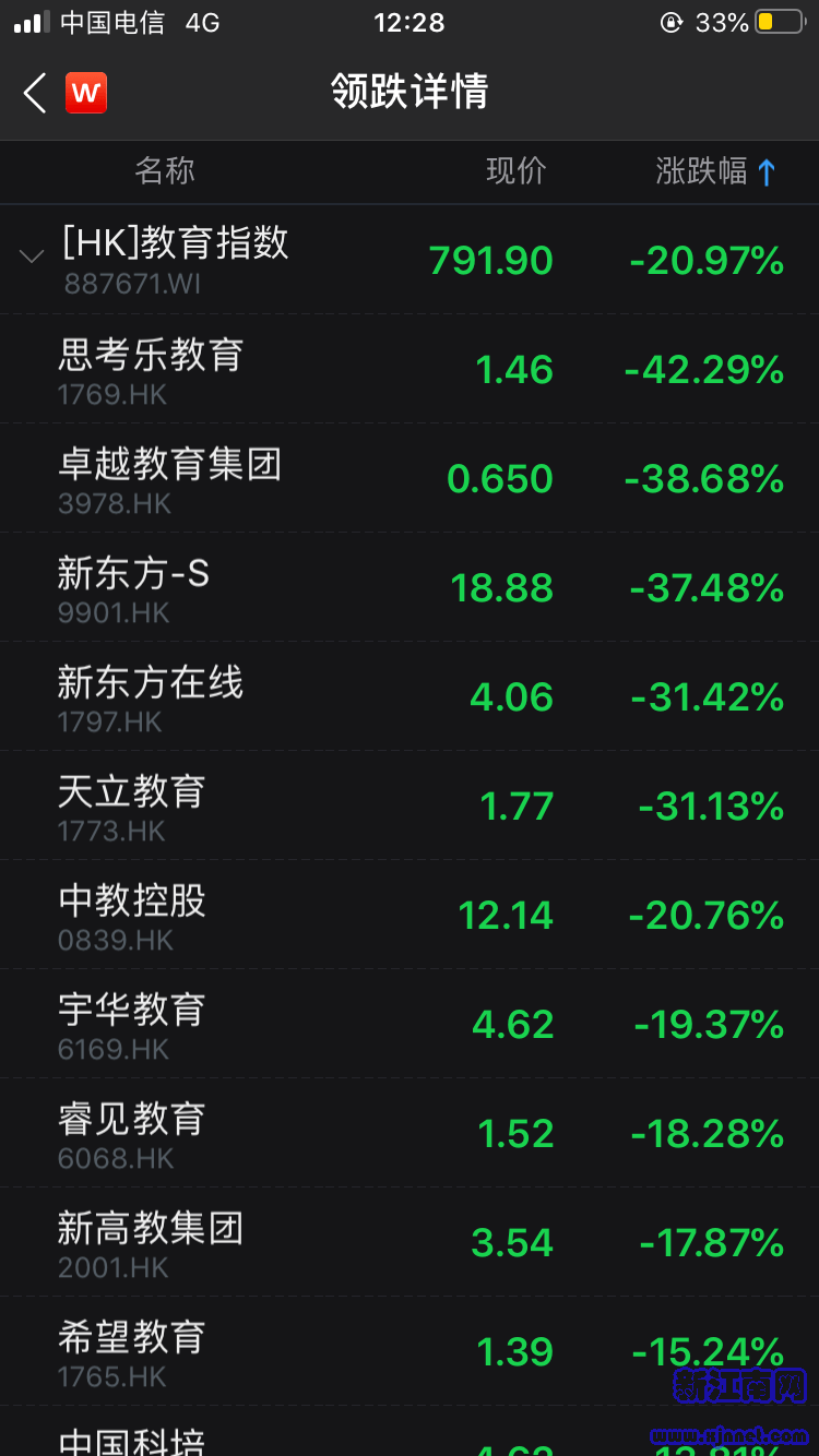 港股教育股開盤后全線大跌,截至午間休盤,新東方跌37.48%,新東方在線跌31.42%。思考樂教育跌超42%,卓越教育集團跌38%。值得注意的是,思考樂教育上周五已經(jīng)跌超28%,今天繼續(xù)大跌,從去年10月高位以來,股價已經(jīng)跌超90%。