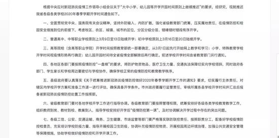 3月9日起陸續(xù)開學(xué)!這兩地率先明確開學(xué)時間教育部黨組2月28日印發(fā)通知,全面部署統(tǒng)籌做好教育系統(tǒng)新冠肺炎疫情防控和教育改革發(fā)展工作。通知明確,全國大中小學(xué)、幼兒園等開學(xué)時間原則上繼續(xù)推遲。通知要求,各地中小學(xué)要錯時錯峰開學(xué),要綜合考慮區(qū)域疫情風(fēng)險等級、交通狀況、應(yīng)急準(zhǔn)備、學(xué)校人群密度、學(xué)齡階段特點等,做好中小學(xué)(含幼兒園、中等職業(yè)學(xué)校)錯區(qū)域、錯層次、錯時開學(xué)方案。當(dāng)天,有兩省率先發(fā)布通告,明確了部分學(xué)校的開學(xué)時間。青海省人民政府發(fā)布《青海省人民政府通告(第15號)》,明確了部分學(xué)校的開學(xué)時間,具體如下:普通高中、中等職業(yè)學(xué)校原則上3月9日至13日陸續(xù)開學(xué);初中學(xué)校原則上3月16日至20日陸續(xù)開學(xué)。高等院校(含高等職業(yè)學(xué)院)開學(xué)時間按照教育部統(tǒng)一部署確定,從3月1日起先行開始網(wǎng)上教學(xué)和學(xué)習(xí);小學(xué)、特殊教育學(xué)校開學(xué)時間視疫情形勢再行確定;幼兒園開園時間待全省疫情全部解除后再行確定。前述學(xué)校開學(xué)時間由省教育部門另行通知。