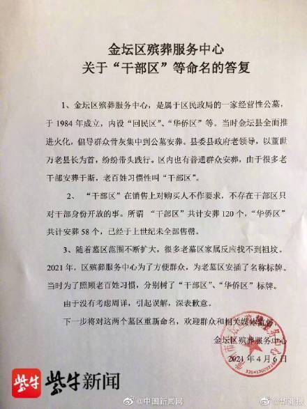 據(jù)介紹,該處公墓名叫“金壇區(qū)殯葬服務(wù)中心”。金壇區(qū)殯葬服務(wù)中心(區(qū)公墓辦)是屬于區(qū)民政局下屬的經(jīng)營(yíng)性公墓,于1984年成立,內(nèi)設(shè)“回民區(qū)”、“華僑區(qū)”等墓區(qū)。當(dāng)時(shí)金壇縣全面推進(jìn)火化,倡導(dǎo)群眾骨灰集中到公墓安葬?h委縣政府老領(lǐng)導(dǎo)紛紛帶頭踐行骨灰集中安放,區(qū)內(nèi)也有普通群眾安葬,由于很多老干部安葬于此,老百姓口中習(xí)慣性叫“干部區(qū)”。“干部區(qū)”墓地在銷售上對(duì)購(gòu)買人不作要求,不存在只對(duì)干部身份的人開(kāi)放。“干部區(qū)”共有墓穴120個(gè),“華僑區(qū)”共有墓穴58個(gè),已于上世紀(jì)末全部售罄。隨著公墓向公園化發(fā)展,今年區(qū)殯葬服務(wù)中心對(duì)公墓的基礎(chǔ)設(shè)施進(jìn)行了改造,墓區(qū)結(jié)構(gòu)發(fā)生了明顯變化,很多老墓區(qū)家屬反應(yīng)找不到祖墳。2021年,區(qū)殯葬服務(wù)中心為了方便群眾祭祖,為老墓區(qū)安插了名稱標(biāo)牌。當(dāng)時(shí)為了照顧老百姓習(xí)慣,分別樹(shù)了“干部區(qū)”“華僑區(qū)”標(biāo)識(shí)牌。由于沒(méi)有考慮周詳,引起誤解,在此金壇區(qū)殯葬服務(wù)中心深表歉意。下一步金壇區(qū)殯葬服務(wù)中心將對(duì)這兩個(gè)墓區(qū)重新命名,歡迎廣大網(wǎng)友和媒體監(jiān)督。