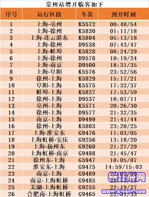 今年“五一”小長假期間,常州地區(qū)鐵路客流以長三角短途客流為主,流向多為江浙滬及安徽等地。據(jù)預(yù)測,客流高峰日為5月1日,全站預(yù)計發(fā)送旅客6.9萬人次。為滿足旅客出行需求,鐵路常州站在管內(nèi)圖定高峰線的基礎(chǔ)上,新增旅客列車39列,主要方向為上海、徐州、合肥、阜陽、蚌埠、安慶、亳州、連云港、揚州等地。其中,常州站新增旅客列車26列,常州北站新增旅客列車13列,具體列車開行情況請以車站公告和中國鐵路客戶服務(wù)中心12306網(wǎng)站公告為準。
