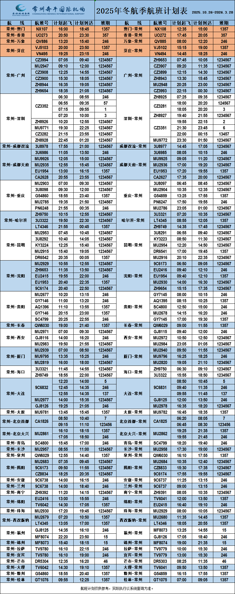 自2025年10月26日起,常州機(jī)場將執(zhí)行冬春航季航班計(jì)劃,27家國內(nèi)外航司、37座寶藏城市航點(diǎn)帶你奔赴心之所向。