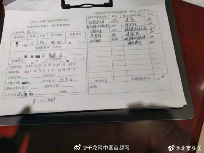 鄭女士3月底在為自己的婆婆進(jìn)行喪葬時(shí),也遇到了類似的情況,同樣是在北醫(yī)三院。鄭女士說(shuō),婆婆在北醫(yī)三院醫(yī)治無(wú)效去世后,被送去了北醫(yī)三院的太平間停放,三天后結(jié)算時(shí),被告知要交將近2萬(wàn)塊錢的殯葬服務(wù)費(fèi)。“有一個(gè)5990的叫感恩致孝,我到現(xiàn)在也不知道感恩致孝是什么,讓我特別吃驚。我說(shuō)這個(gè)900是什么錢,他說(shuō)等于是擱到死人身下,那種紙銅錢兒。北醫(yī)三院的太平間,從那個(gè)半地下的抬出來(lái),沒(méi)有100米,要1200,他只不過(guò)給你鋪一個(gè)金色的地毯。還一個(gè)800塊錢的叫鮮花引路。其他3000元叫綜合服務(wù),我到現(xiàn)在不知道這綜合服務(wù)里邊是什么。老人們活著的時(shí)候勤儉一輩子,你讓他死了這么厚葬干嘛呀。”(北京新聞廣播)