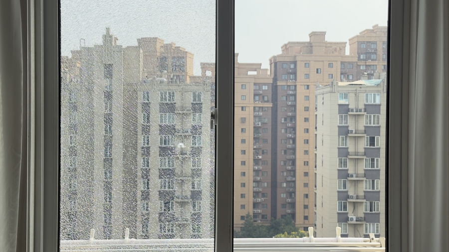 記者從劉女士拍攝的照片看到,這枚孔洞位于左側(cè)玻璃窗戶靠近把手附近,基本呈圓形狀,經(jīng)紙尺簡單測量,洞的直徑在0.4-0.6毫米左右。整扇玻璃窗長125厘米,寬60厘米,裂痕以孔洞為中心,呈輻射狀四散,從頂端一直裂到底端。推窗看去,該小區(qū)多棟居民樓正對涉事玻璃窗,直線距離超過10米。