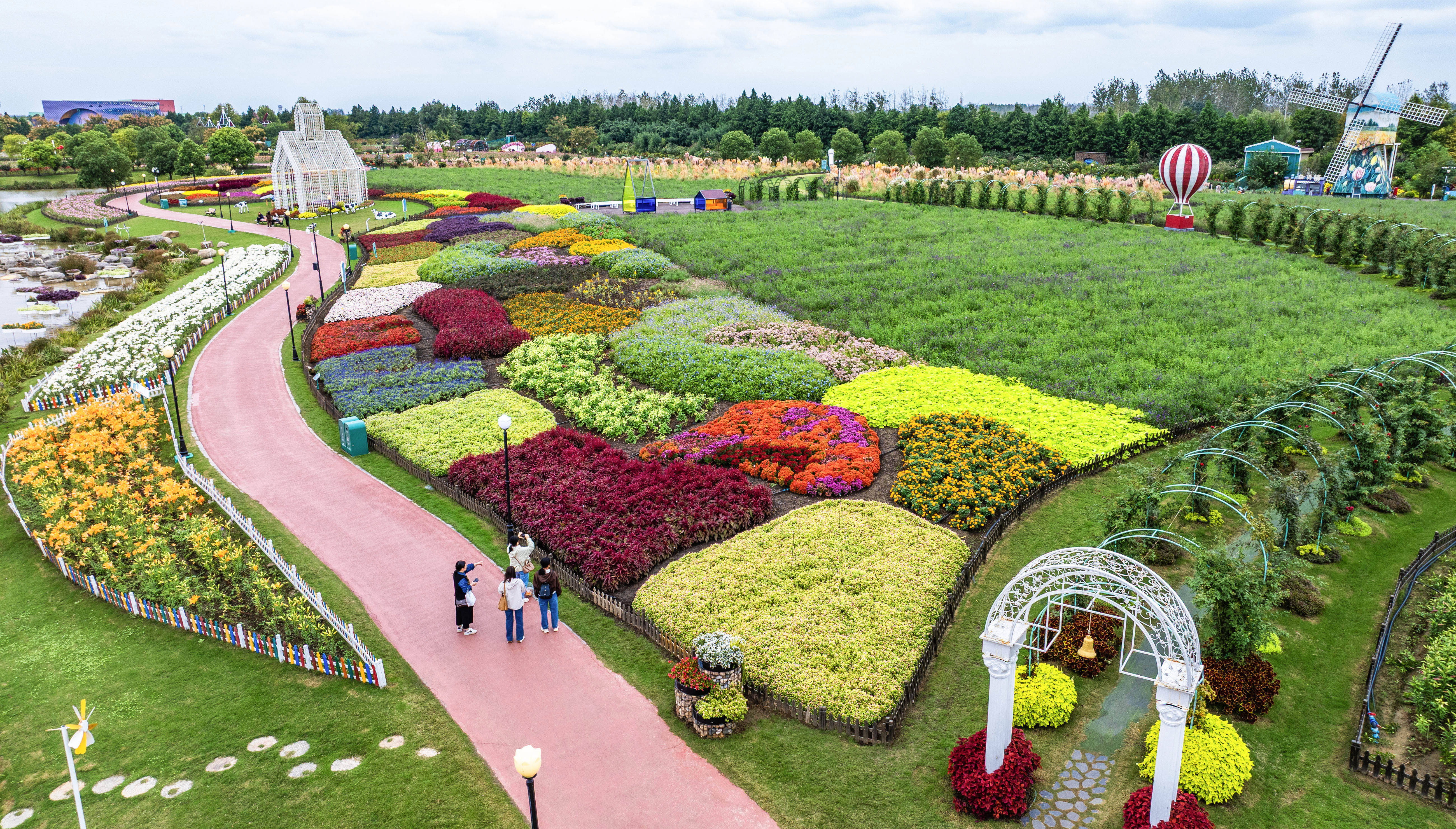 10月19日,游客在江蘇省鹽城市大豐區(qū)荷蘭花海景區(qū)內(nèi)賞花游玩(無人機(jī)照片)。 新華社發(fā)(周社根 攝)