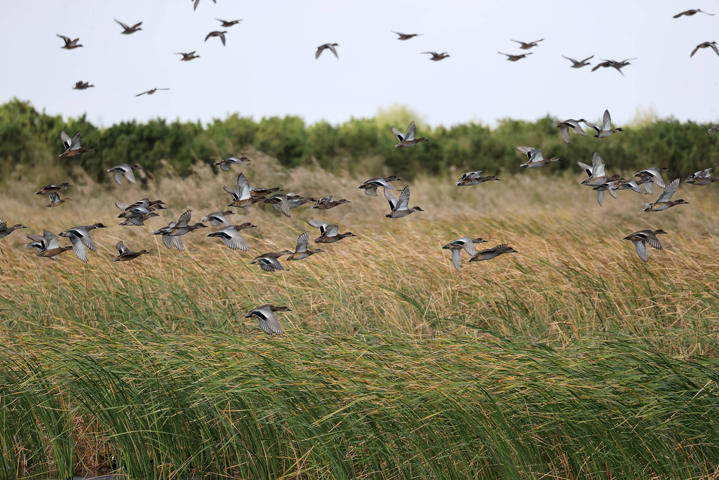 10月18日,在山東黃河三角洲國家級(jí)自然保護(hù)區(qū)濕地,候鳥展翅飛翔。 新華社發(fā)(周廣學(xué) 攝)