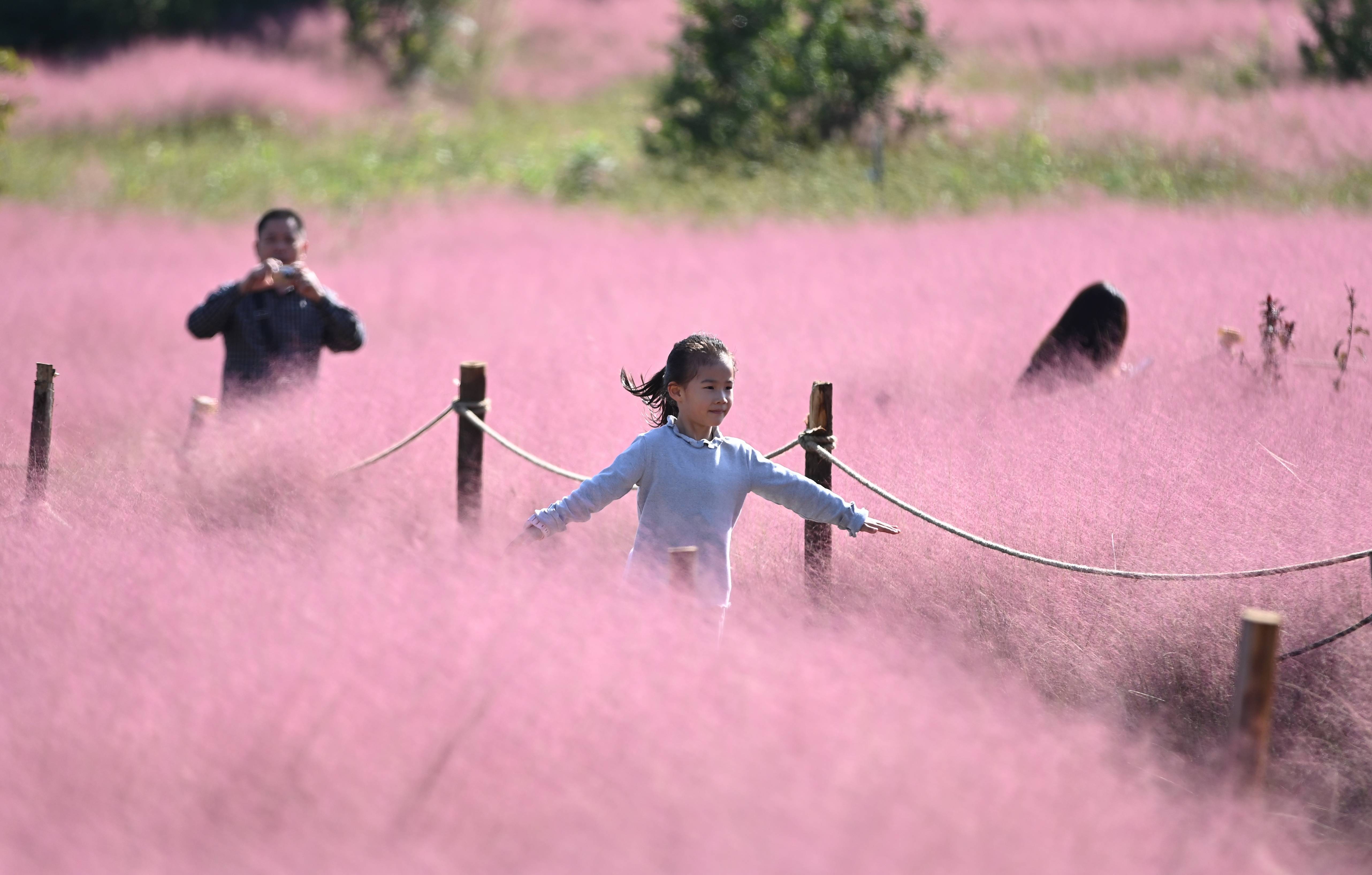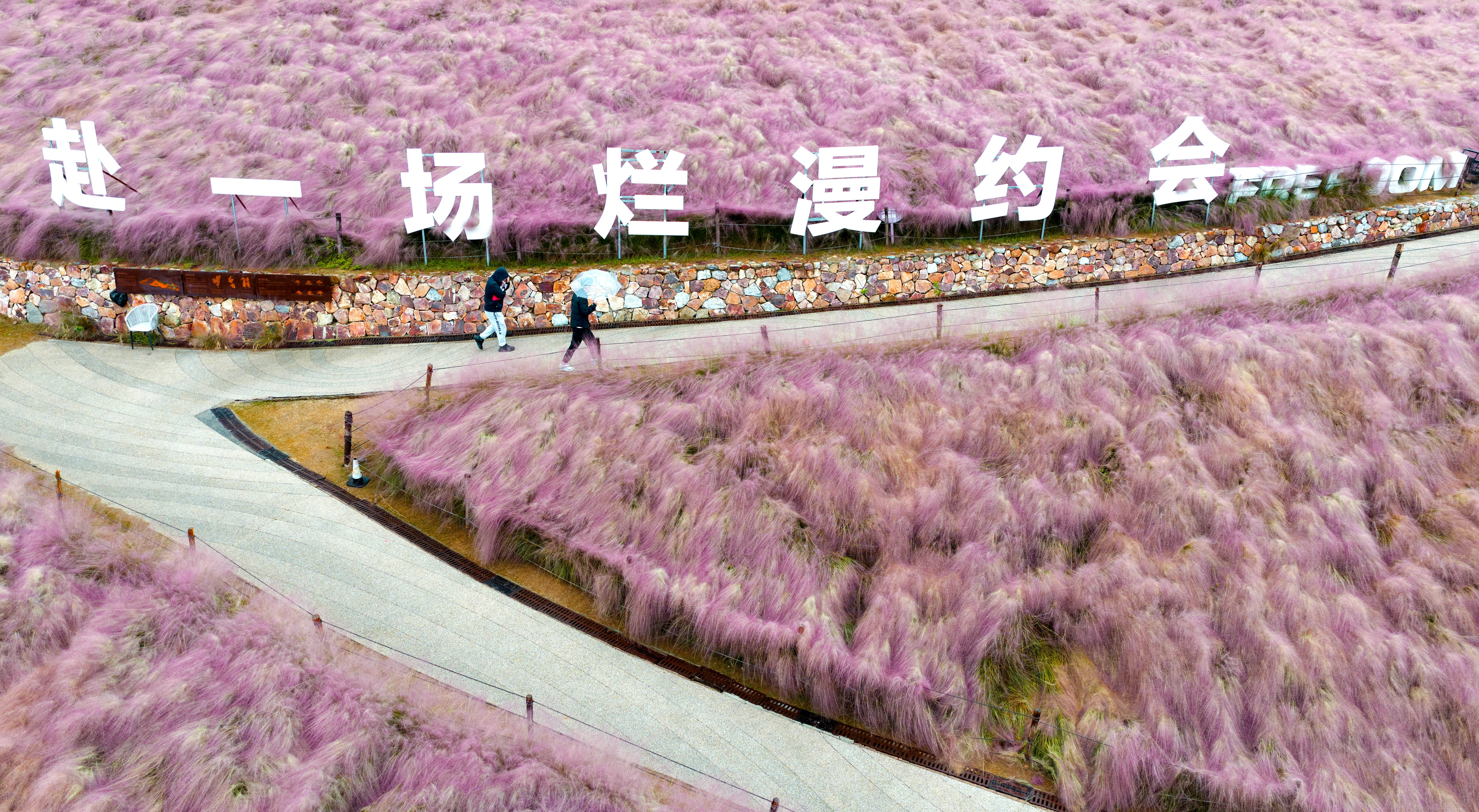 10月19日,在山東省臨沂市沂南縣臥龍山公園,游客在粉黛亂子草中打卡拍照(無人機(jī)照片)。 新華社發(fā)(王彥冰 攝)