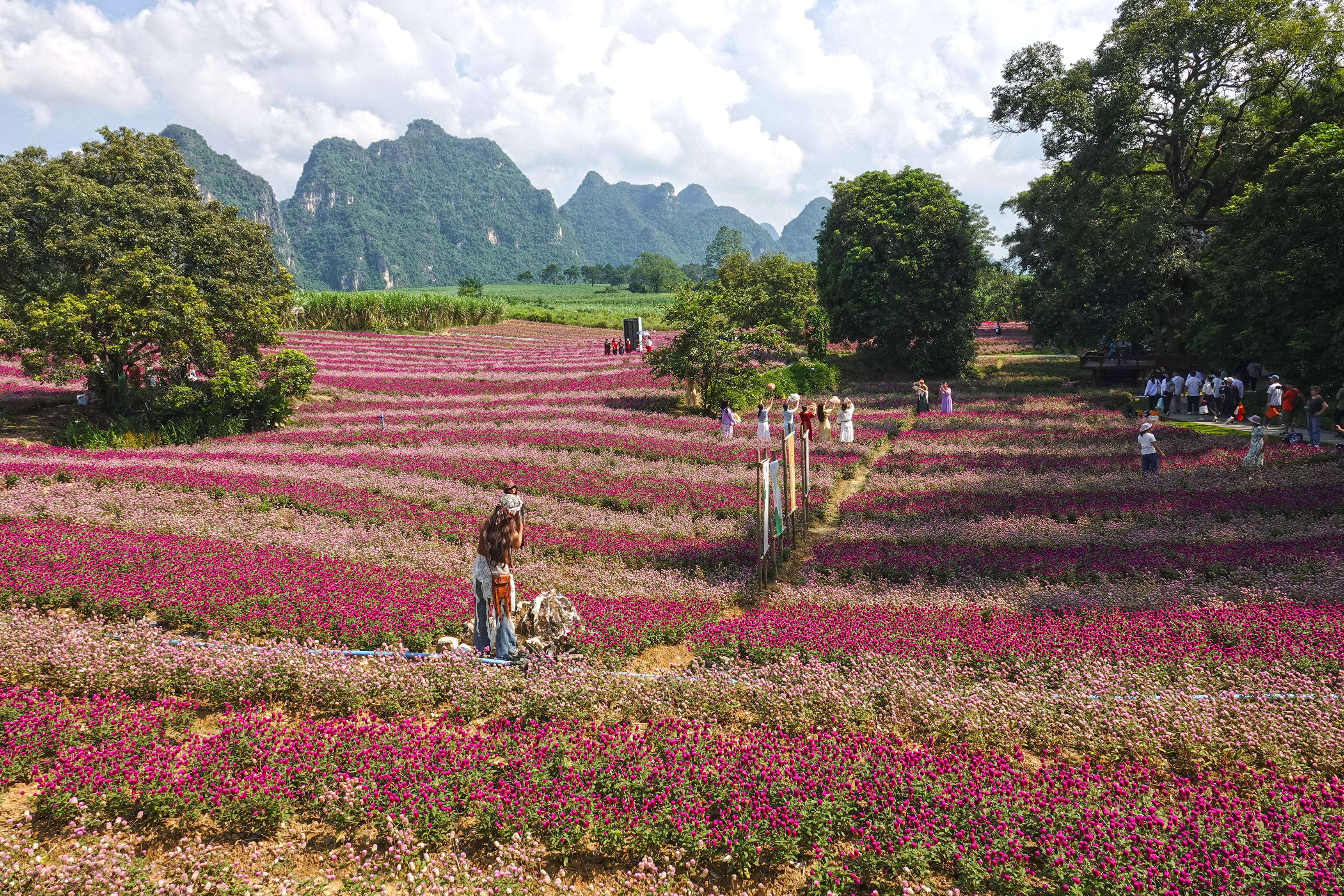 10月18日,游人在廣西大新縣峒那嶼灣景區(qū)千日紅花田賞花游玩。 新華社發(fā)(喻湘泉 攝)