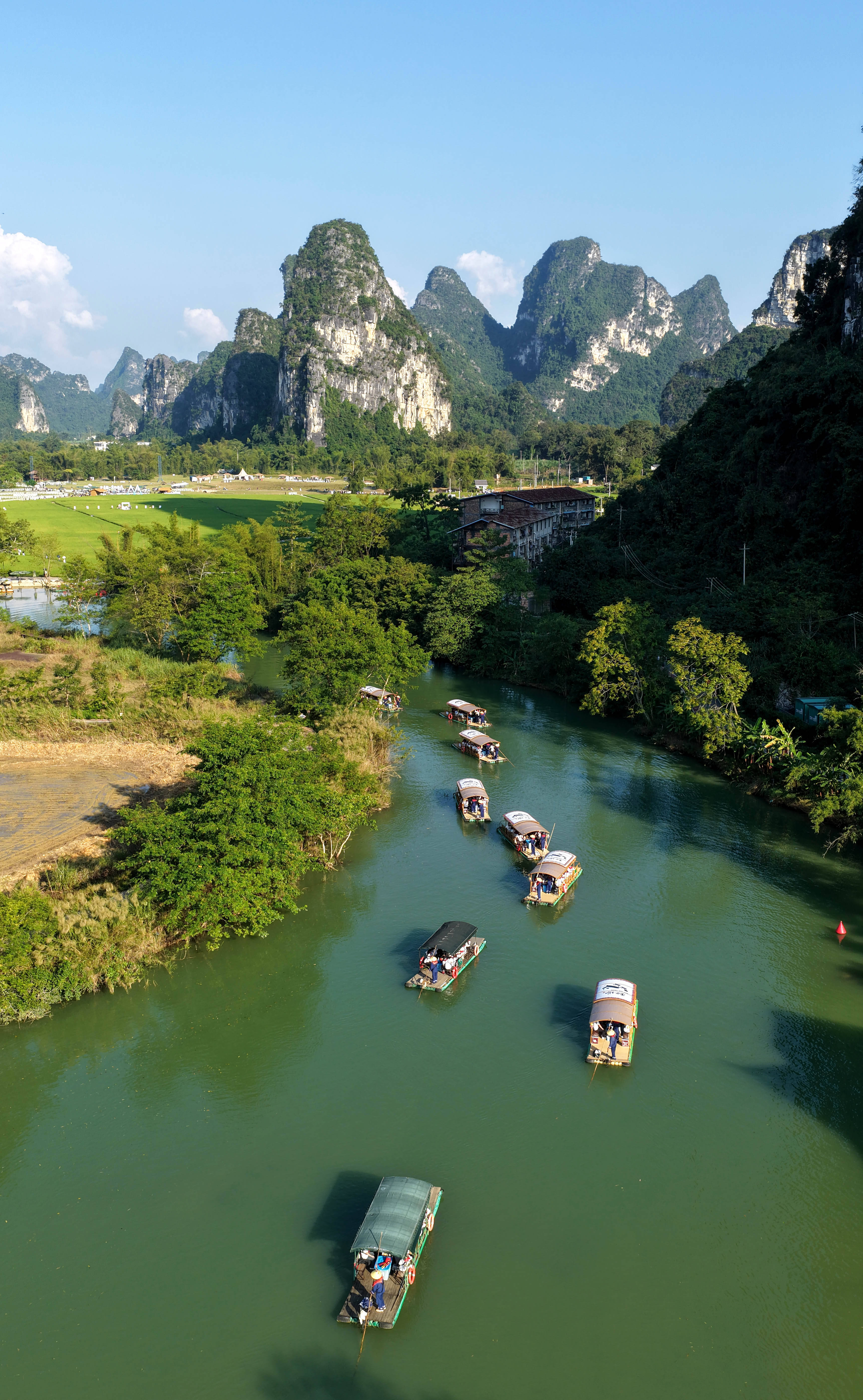 10月18日,在廣西崇左市大新縣堪圩鄉(xiāng)明仕旅游度假區(qū),游客乘坐竹筏在稻田邊的明仕河上游玩。 新華社發(fā)(黎寒池 攝)