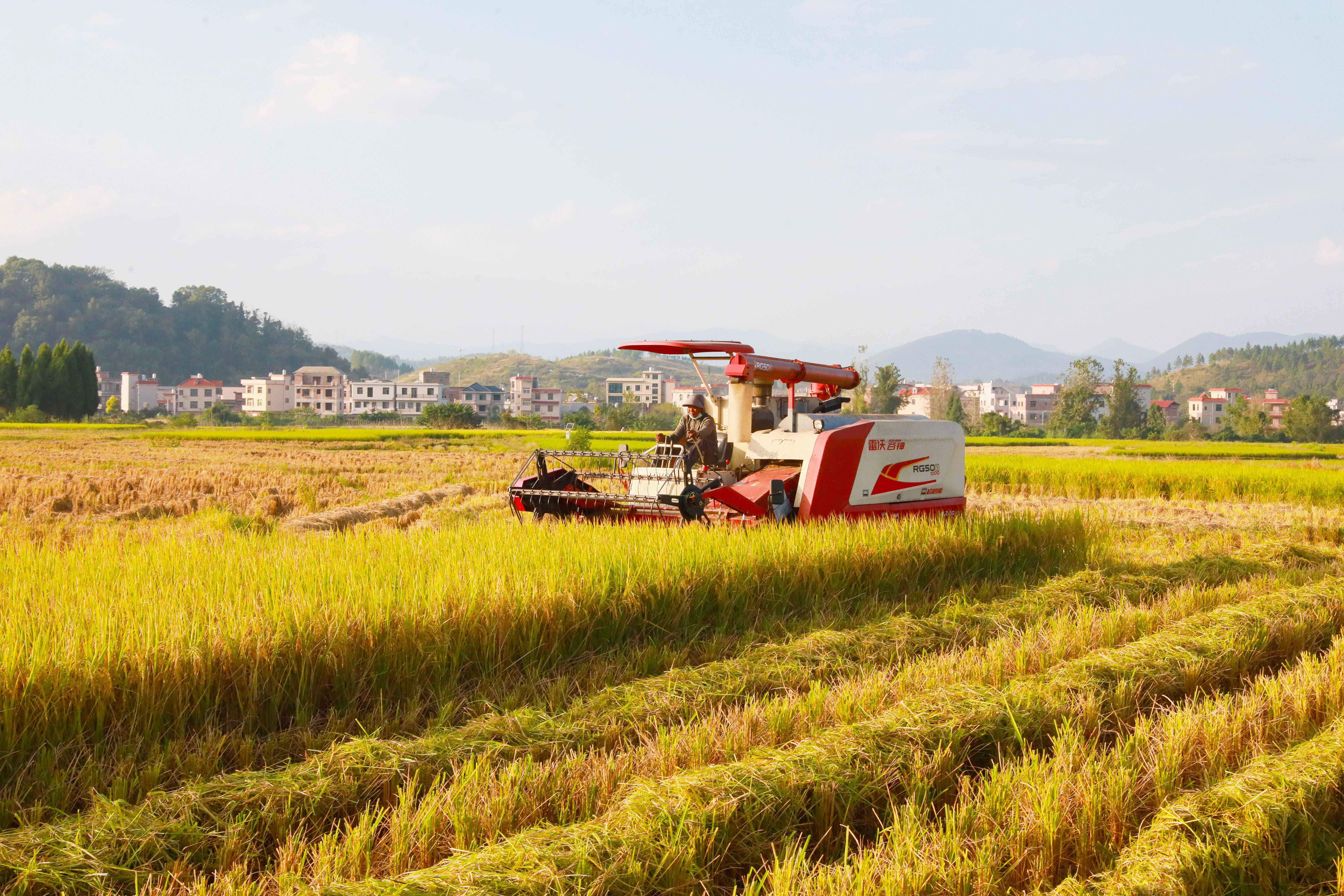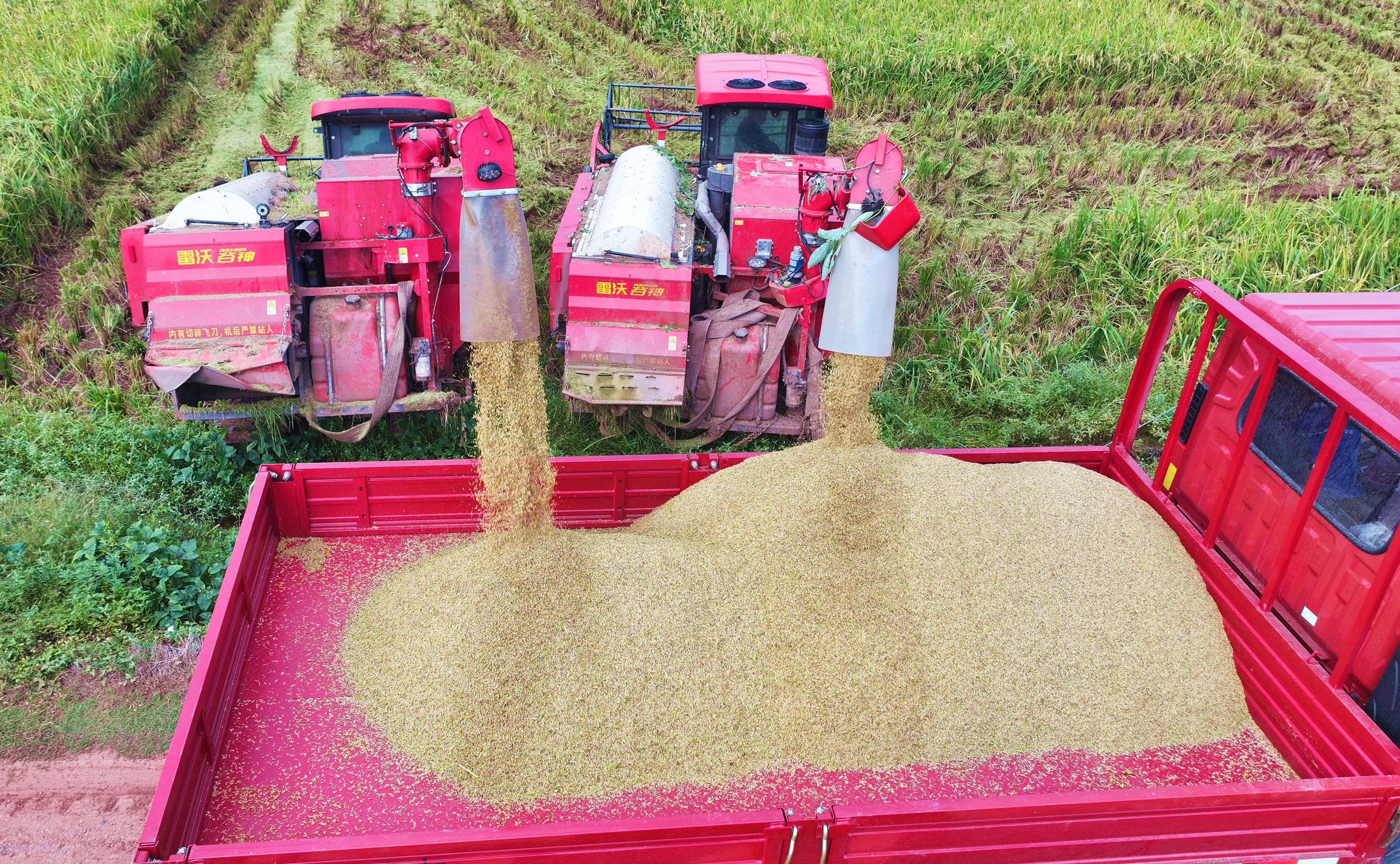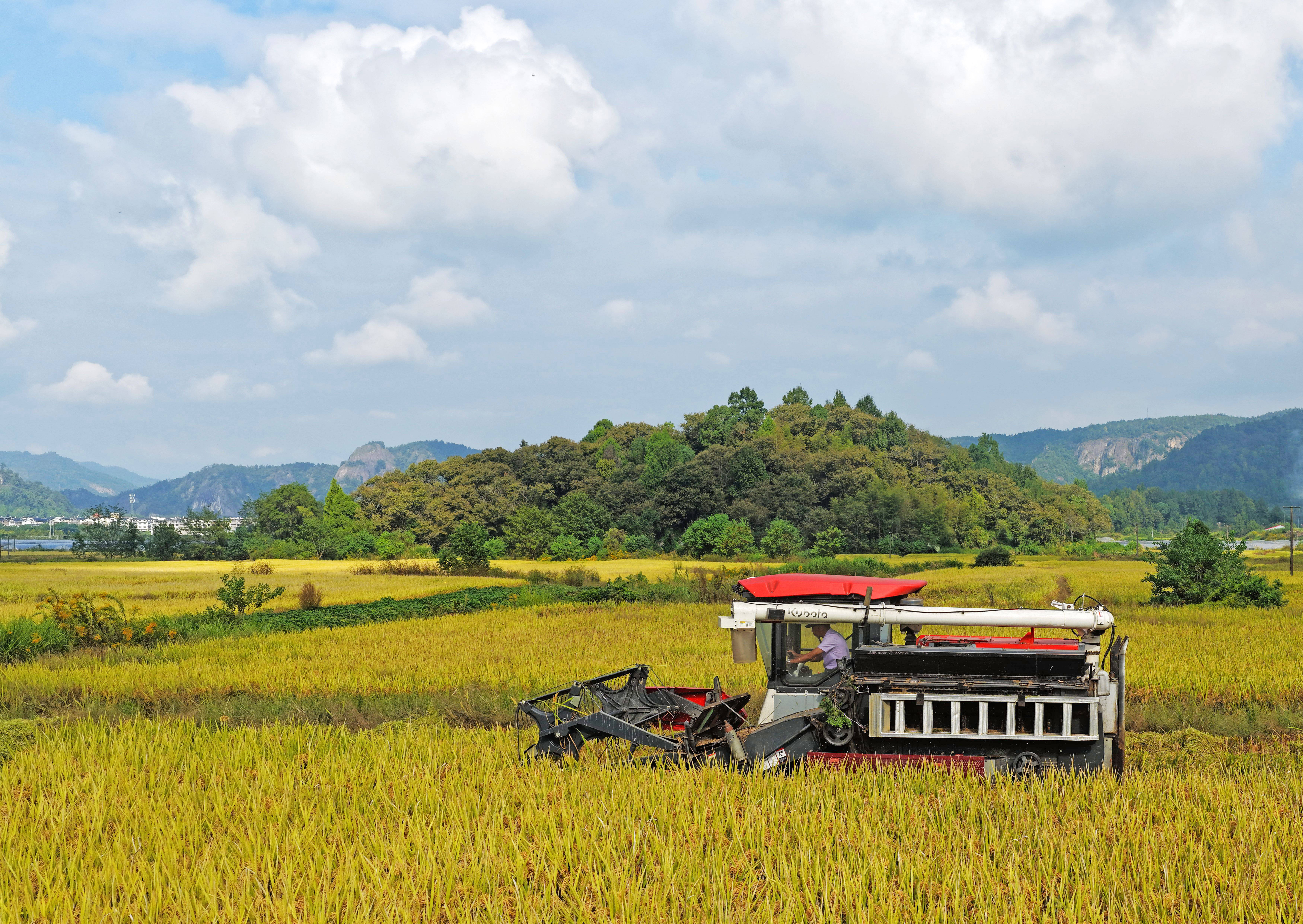 10月15日,在湖南省永州市新田縣新圩鎮(zhèn)上禾塘村,村民駕駛收割機(jī)收獲晚稻。 新華社發(fā)(劉貴雄 攝)