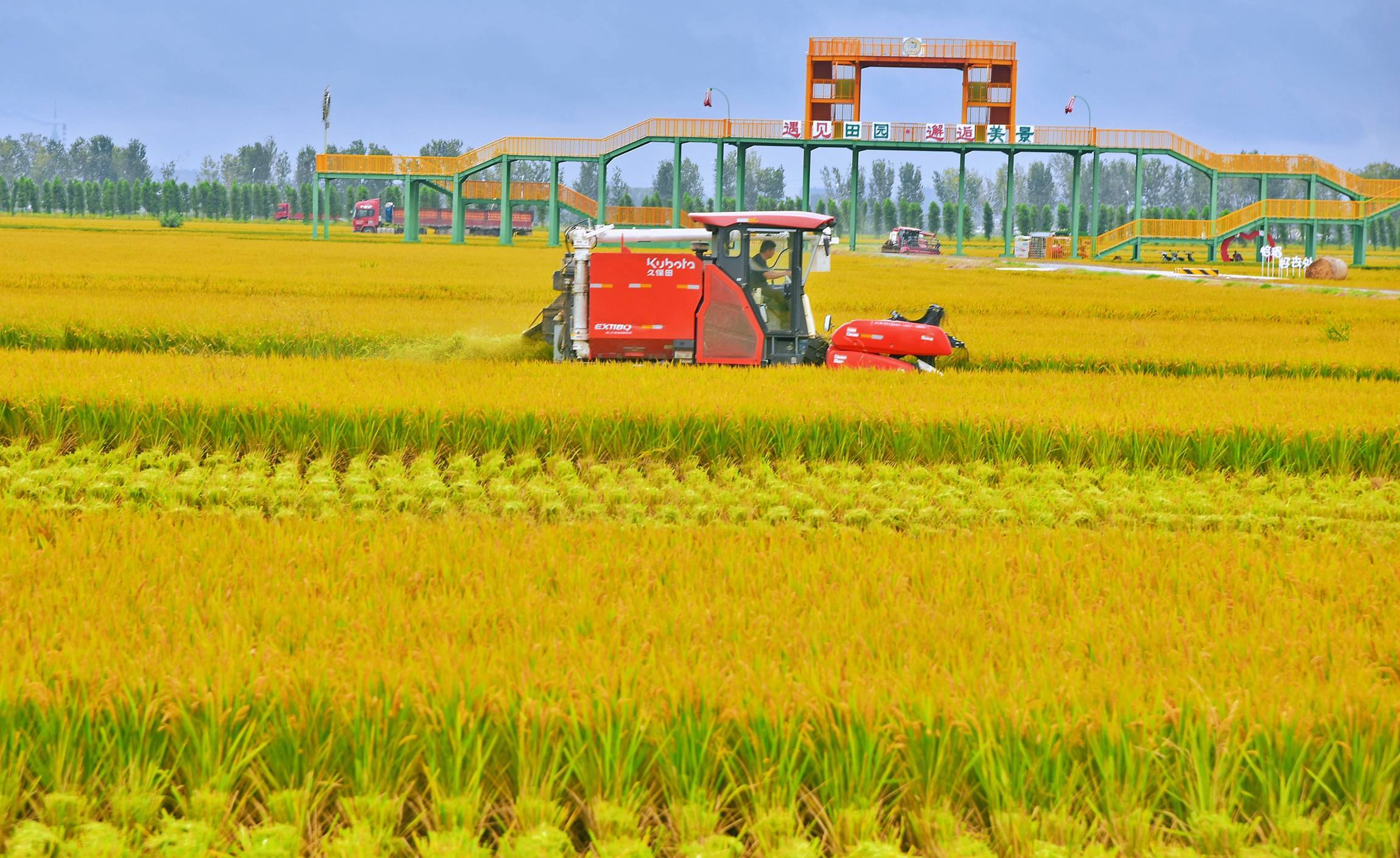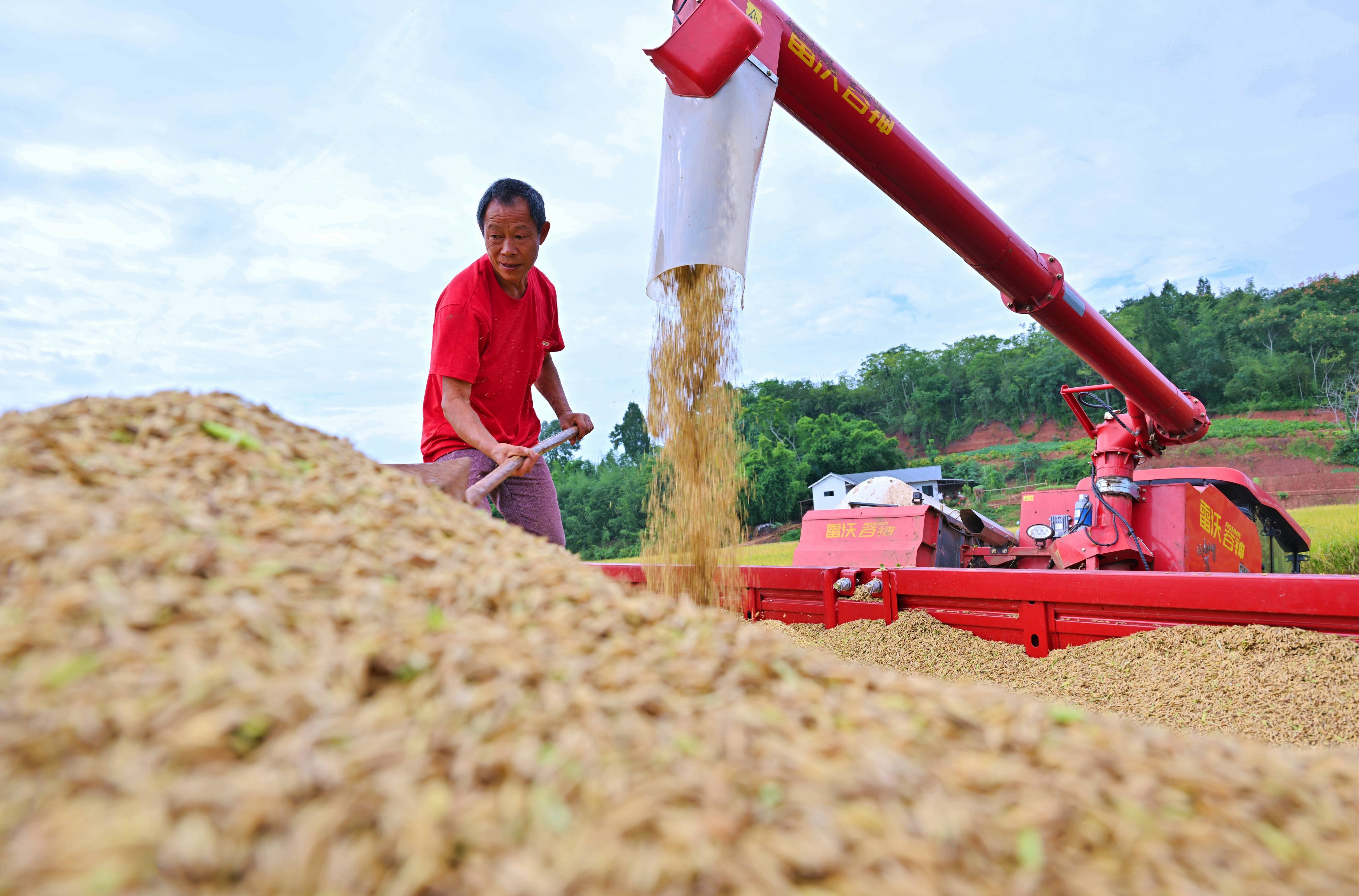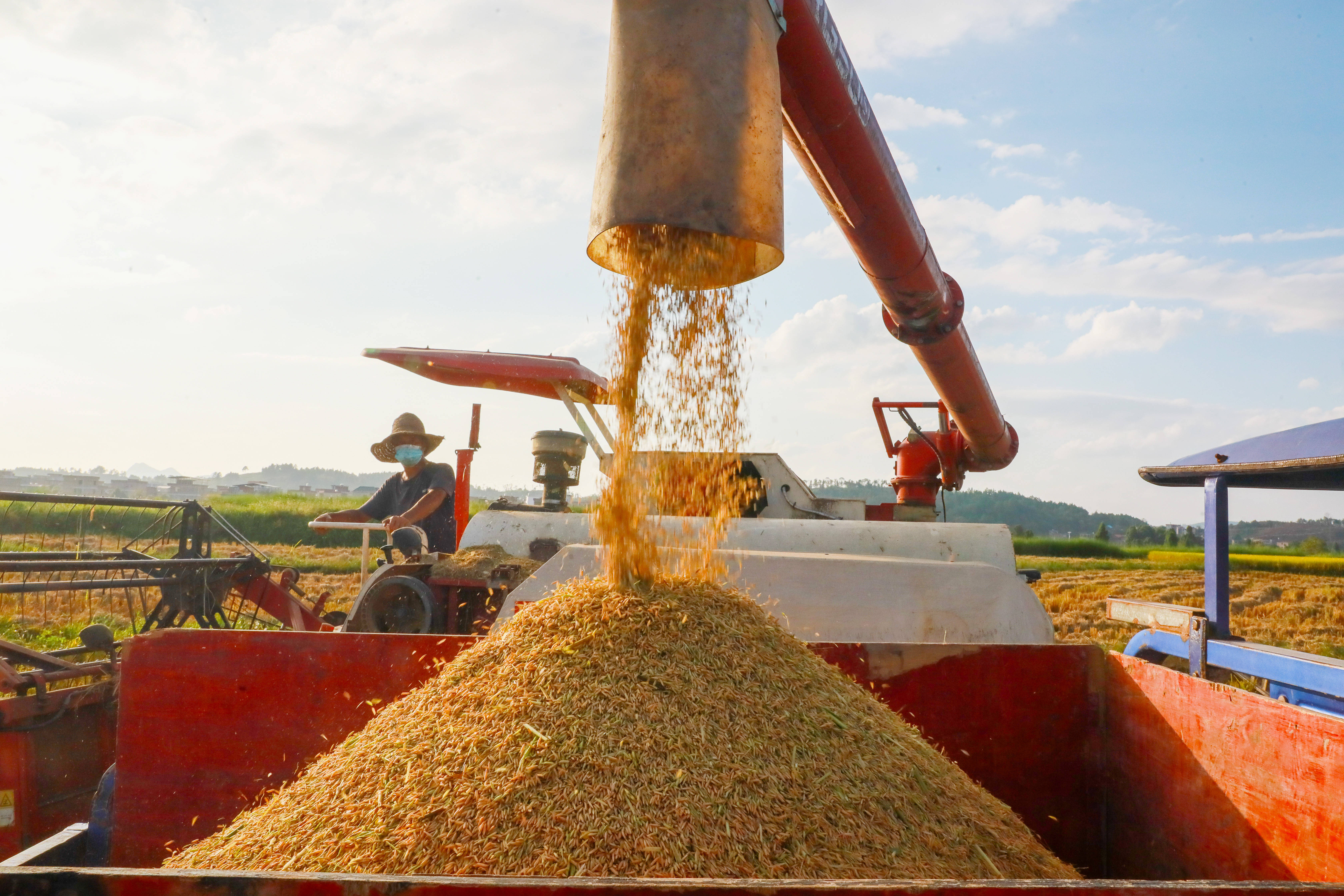 10月15日,在湖南省永州市新田縣新圩鎮(zhèn)上禾塘村,村民駕駛收割機(jī)收獲晚稻。 新華社發(fā)(劉貴雄 攝)