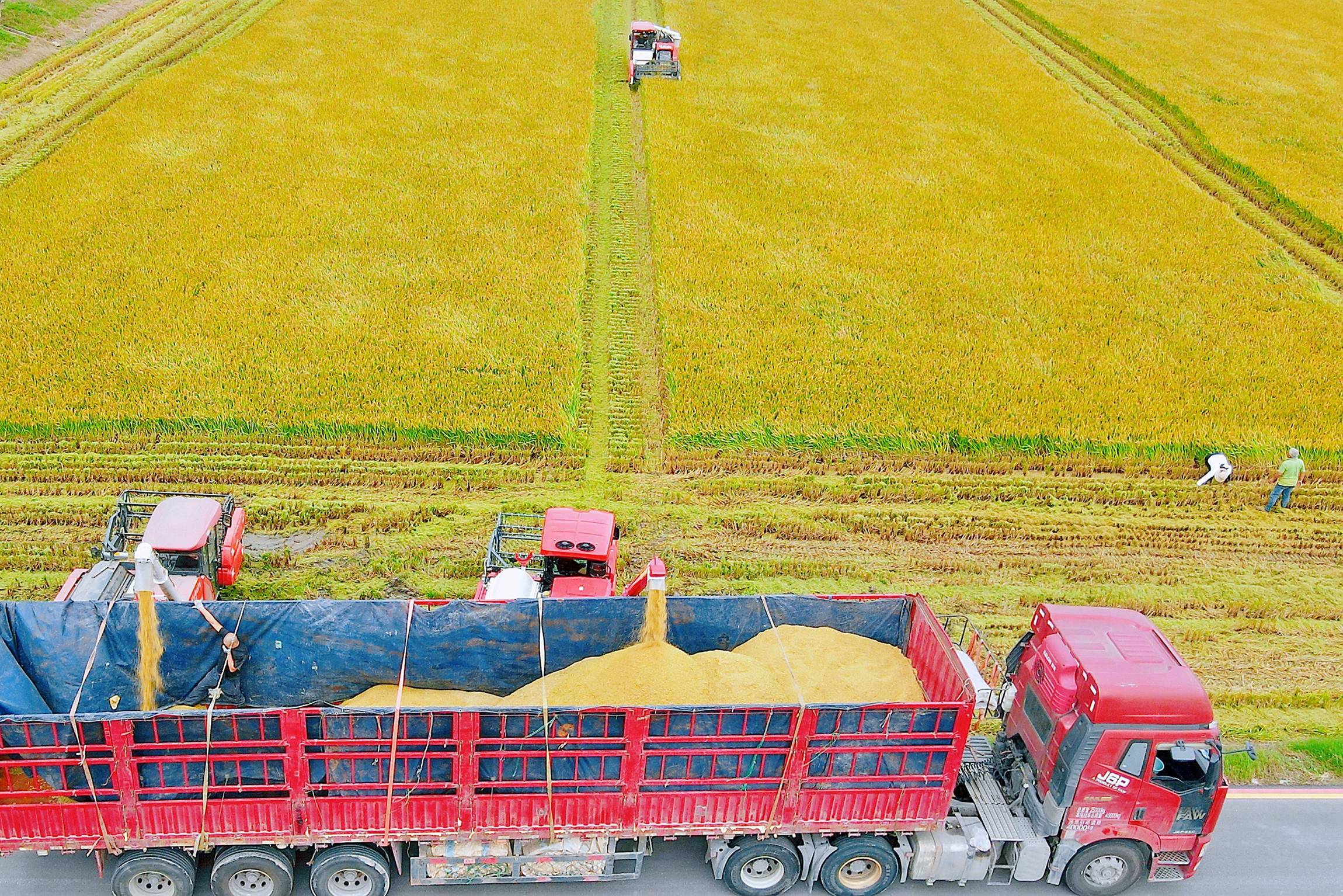 10月16日,在江蘇省連云港市贛榆區(qū)城頭鎮(zhèn)中青墩村,種植戶將收獲的水稻裝車。 新華社發(fā)(司偉 攝)