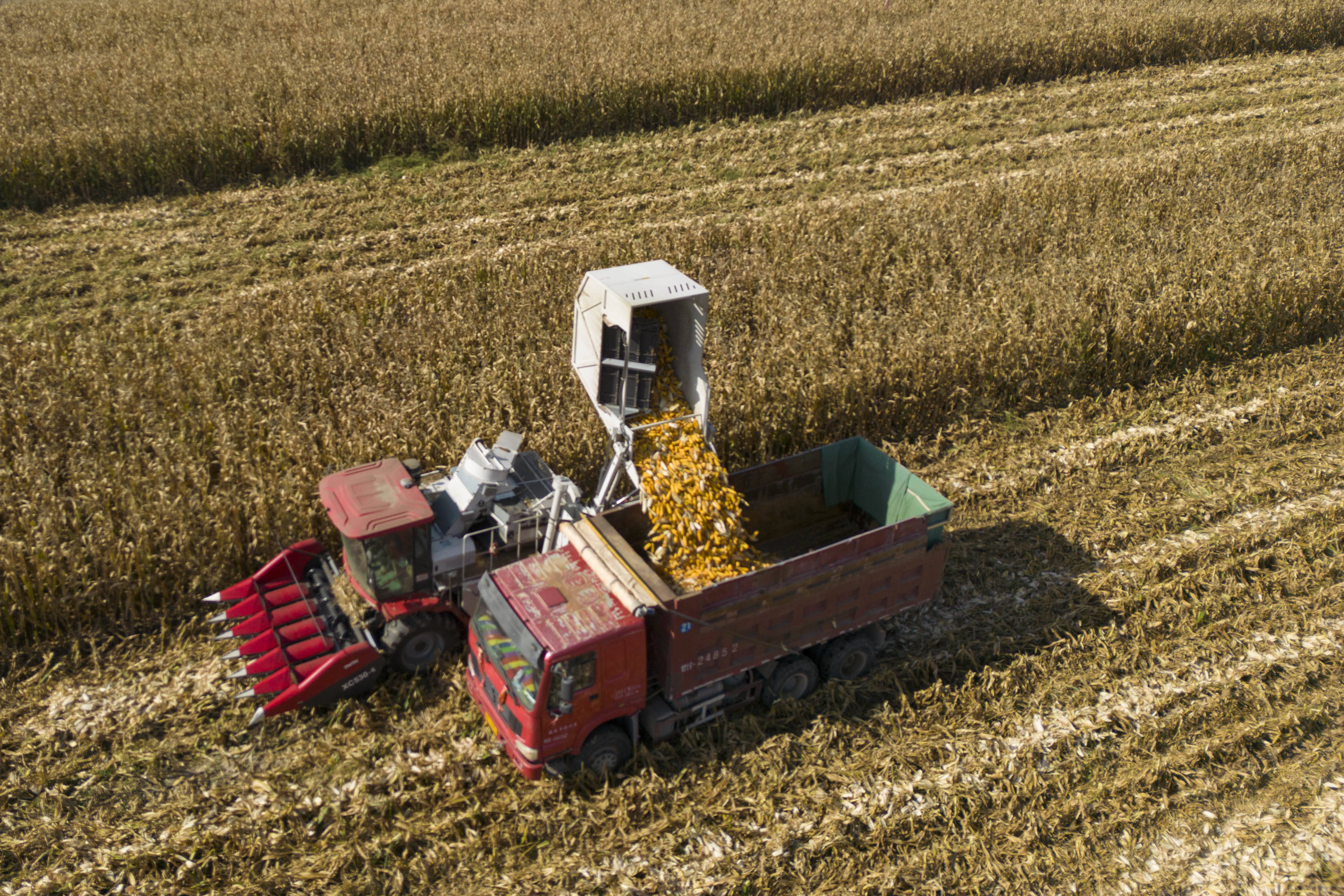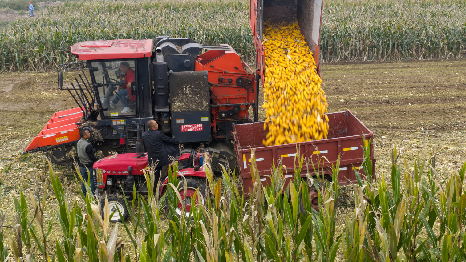 10月15日,在河北省內(nèi)丘縣大原村,村民駕駛機(jī)械收獲玉米(無(wú)人機(jī)照片)。 新華社發(fā)(劉繼東 攝)