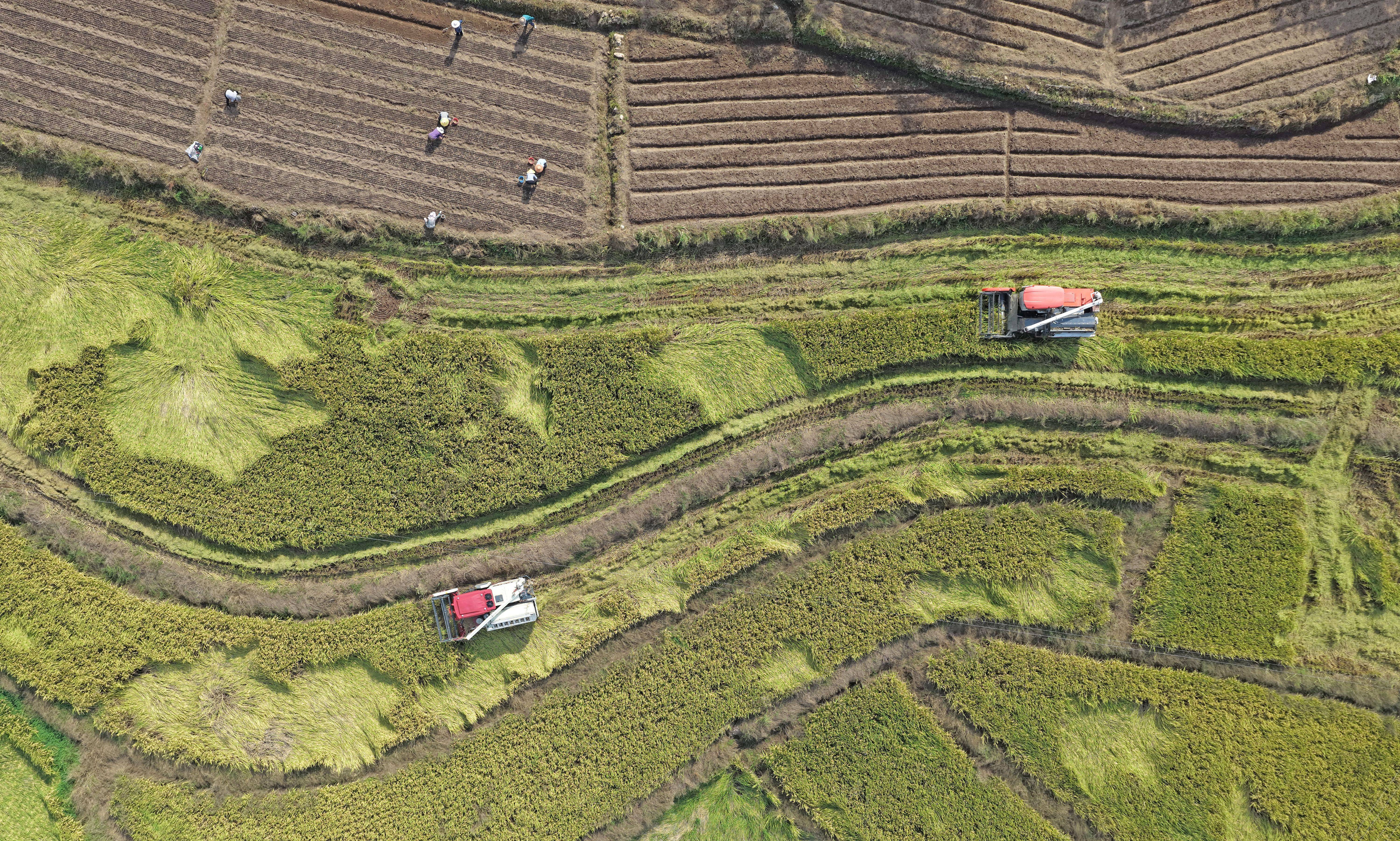 10月17日,在湖南省永州市道縣梅花鎮(zhèn)梅花村,水稻種植大戶采用大型機(jī)械收獲稻谷(無(wú)人機(jī)照片)。 新華社發(fā)(蔣克青 攝)