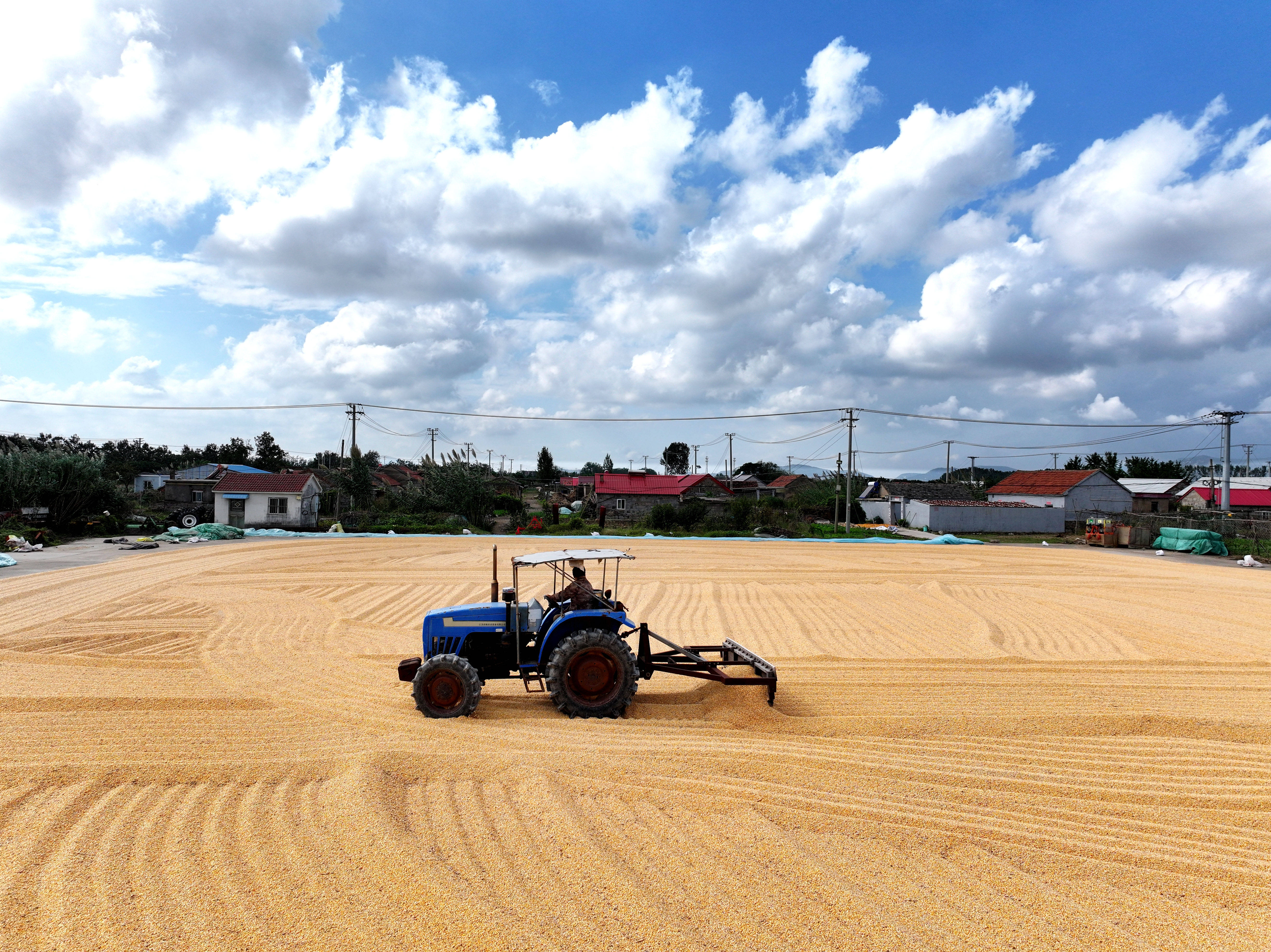 10月16日,在江蘇省連云港市東辛農(nóng)場(chǎng),農(nóng)機(jī)手操作機(jī)械翻曬玉米(無(wú)人機(jī)照片)。 新華社發(fā)(王春 攝)