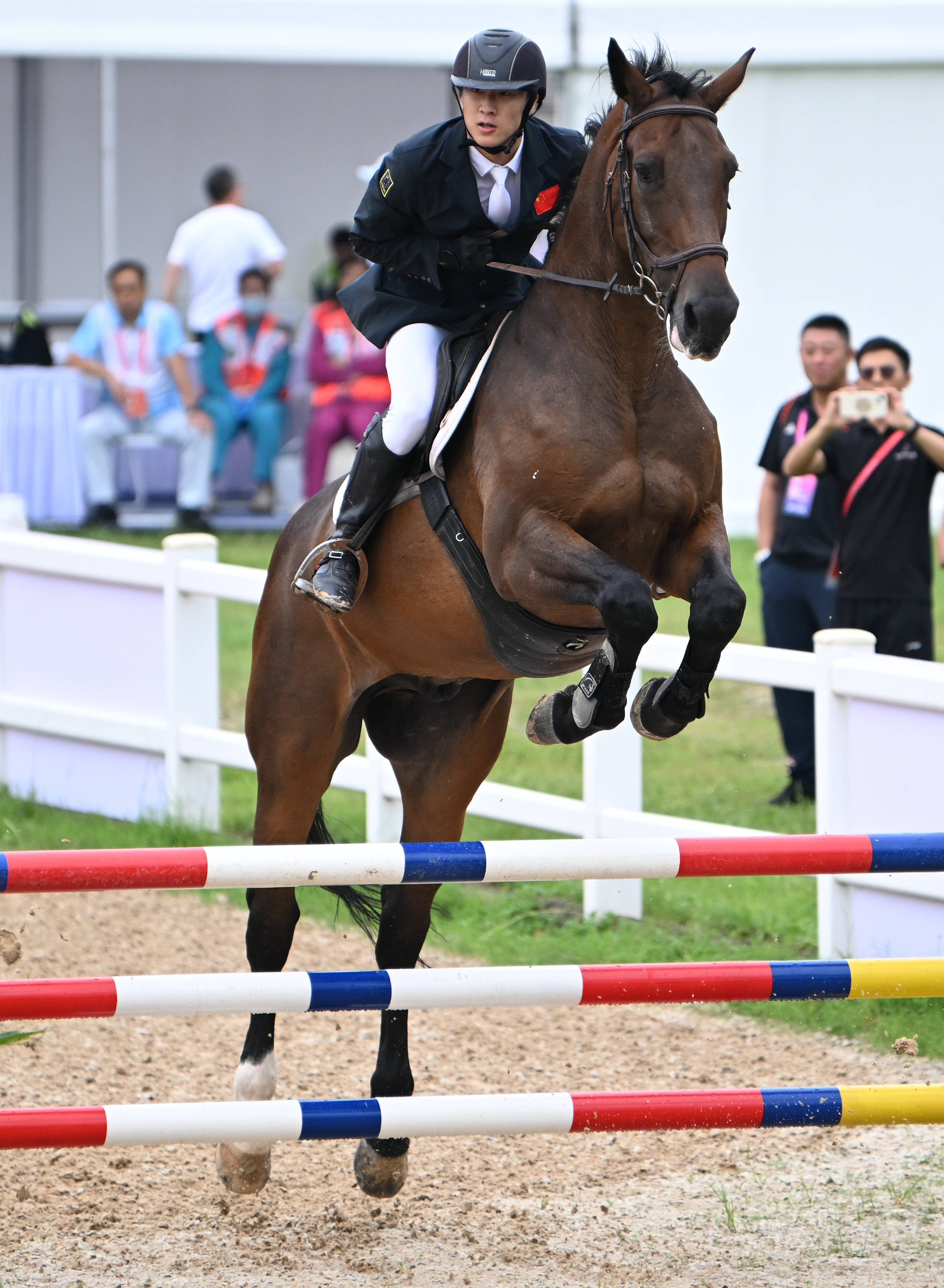 9月21日,湖北隊(duì)選手陳柏良在現(xiàn)代五項(xiàng)馬術(shù)比賽中。 新華社記者 鄧華 攝
