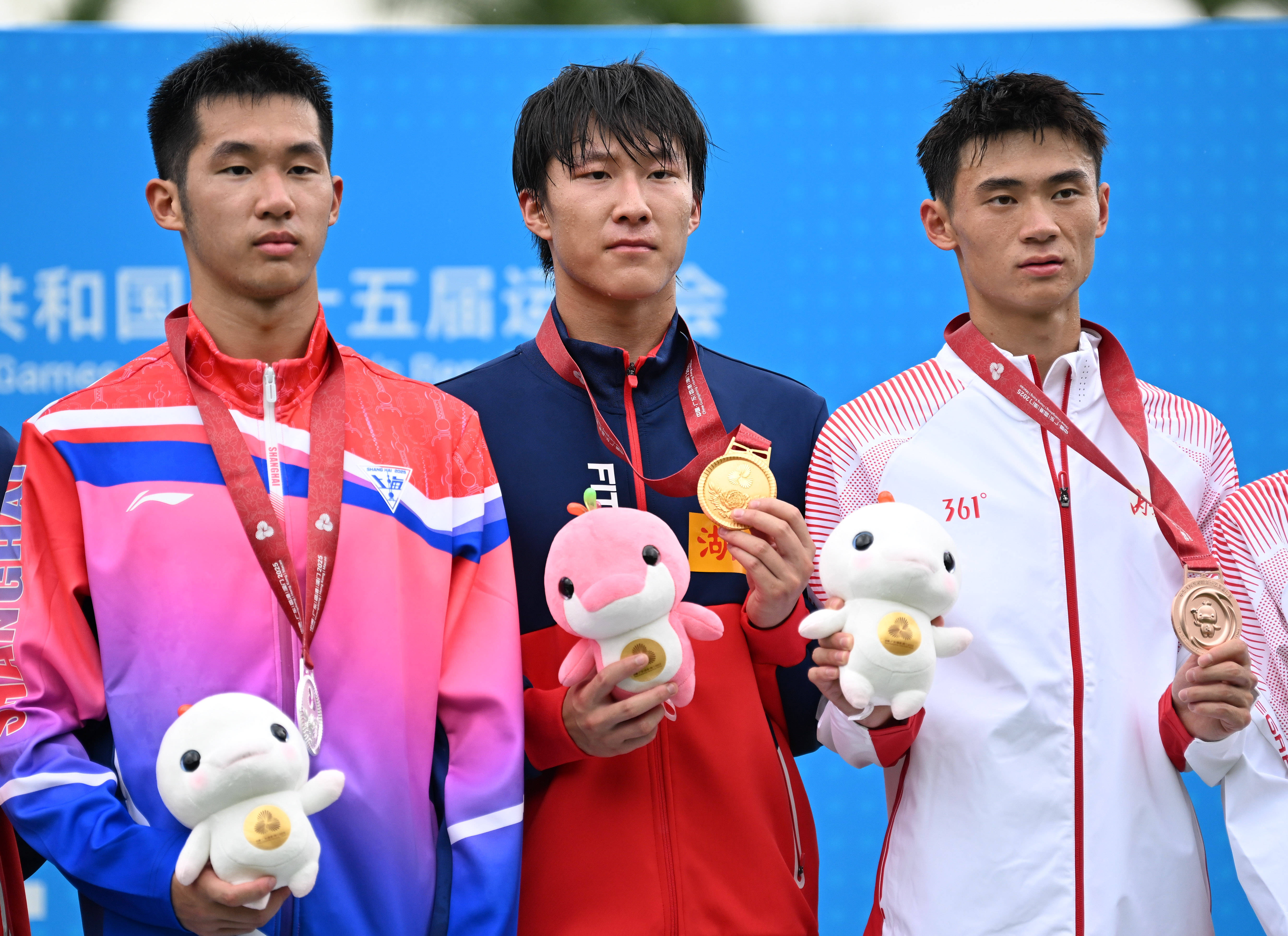9月21日,冠軍湖北隊(duì)選手陳柏良(中)、亞軍上海隊(duì)選手李劉暢(左)和季軍內(nèi)蒙古隊(duì)選手劉振峰在頒獎(jiǎng)儀式上。 新華社記者 鄧華 攝