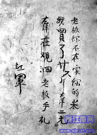 紅軍戰(zhàn)士在為主人留下充足的口糧后,從米缸中稱了26斤大米,并請?zhí)K觀泗老人轉(zhuǎn)交米款二元大洋給不在家中的蘇和。臨行前,紅軍戰(zhàn)士在蘇和家存放大米的房中寫下了一封珍貴的“留款信”。
