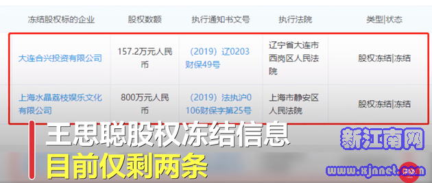 10月10日,企查查APP顯示,自2019年7月15日起,王思聰股權(quán)凍結(jié)陸續(xù)解除,其中解凍企業(yè)包含寧波朗盛投資管理有限公司、上海水晶荔枝娛樂文化有限公司、上海香蕉計劃影視文化有限公司、上海愛洛星食品有限公司等。企查查風(fēng)險信息顯示,王思聰股權(quán)凍結(jié)信息目前僅剩兩條,凍結(jié)數(shù)額為957.2萬。