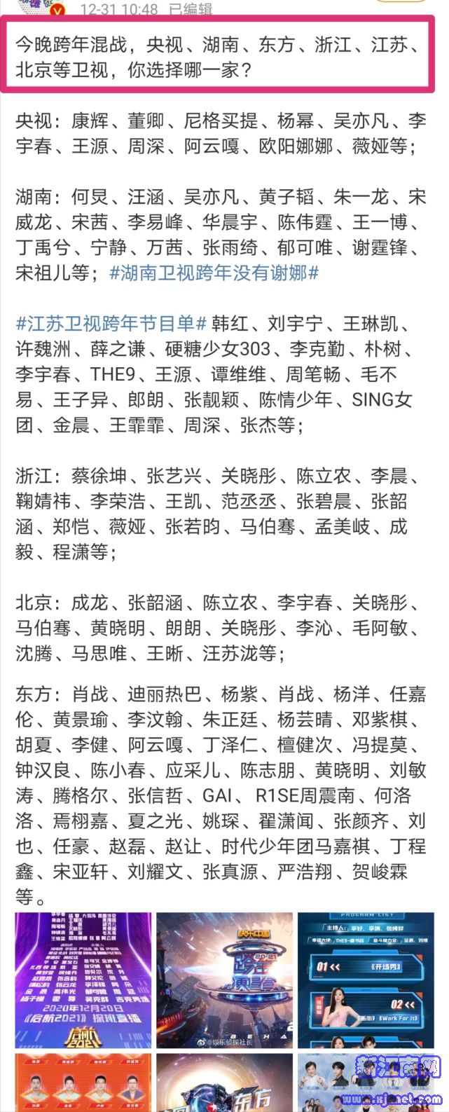 江蘇衛(wèi)視、浙江衛(wèi)視和北京衛(wèi)視3家的跨年演唱會(huì)也不賴,他們邀請(qǐng)眾多年輕藝人捧場(chǎng),THE9和硬糖少女在同一個(gè)演唱會(huì),蔡徐坤、張藝興、孟美岐、楊冪、Angelababy和成毅幾位流量明星來(lái)到浙江衛(wèi)視跨年晚會(huì)。