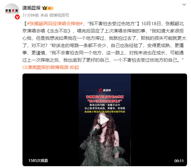 10月18日,張靚穎在北京演唱會唱《念念不忘》,唱完后回應(yīng)了上次在演唱會摔倒的事,“我知道大家很擔(dān)心我,但是我想說如果我在一個地方摔過,我就怕過去了,那我的損失可能就更大了,對不對?”